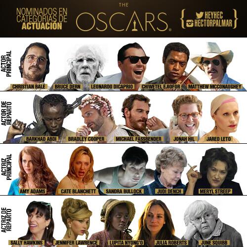 Para Mejor Actriz tenemos a Meryl “socia vitalicia de todos los premios del mundo” Streep por su papel de la inestable pero adorable Violet en AGOSTO, Amy “agregale un poco de sal a tu vida” Adams por AMERICAN HUSTLE, Cate “dame cualquier pero cualquier papel que te lo actúo y me saco un 10” Blanchett por su Jasmine de BLUE JASMINE, la preferida de los críticos (recordemos que viene arrasando con todo: Globo de Oro, SAG y Bafta), Sandra "sé cómo aumentar mi cachet como nadie” Bullock por GRAVITY (de ganarlo este sería el segundo /oscar de la actriz que ya se lo llevó en 2010 por Un sueño posible) y Dame Judy “no hay palabras para definir a esta mujer, pero con M lo es todo estamos” Dench por PHILOMENA. ¿Cómo hacer para elegir una? El sentimiento se asemeja a cuando tenemos que elegir un gusto de helado entre 30. Difícil.